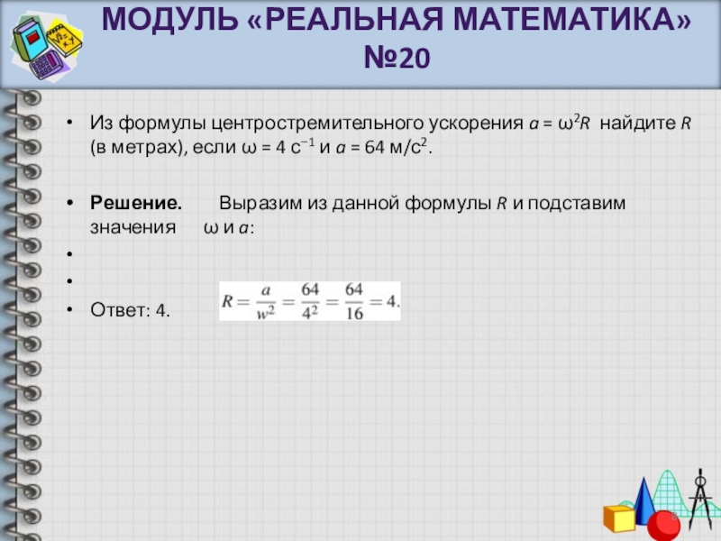 Слайд 8Из формулы центростремительного ускорения a = ω2R найдите R (в метрах), если ω =