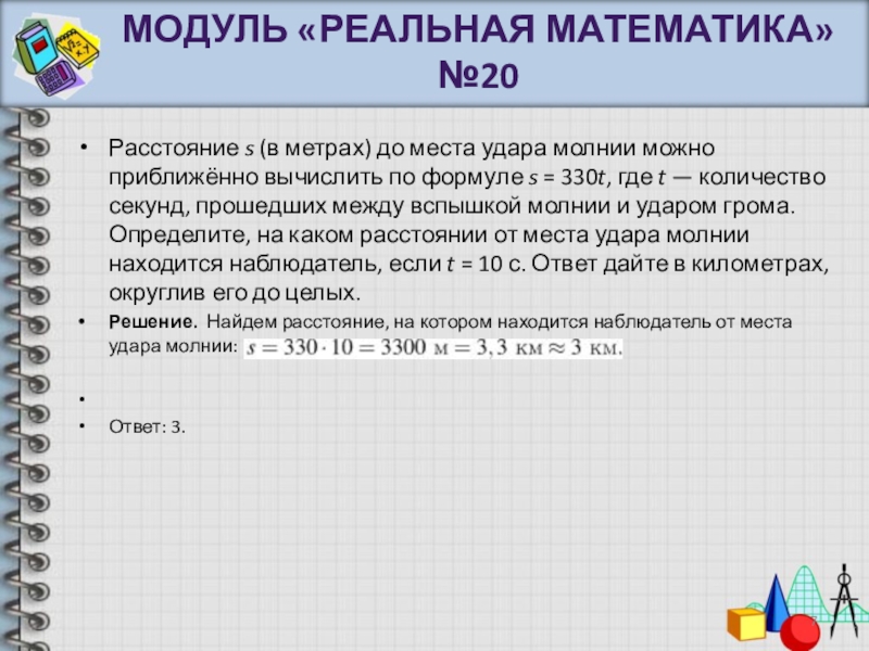 где t — количество секунд, прошедших между вспышкой молнии и ударом грома. Определите, на каком расстоянии от места удара молнии находится наблюдатель, если t = 10 с. Ответ дайте в километрах, округлив его до целых.