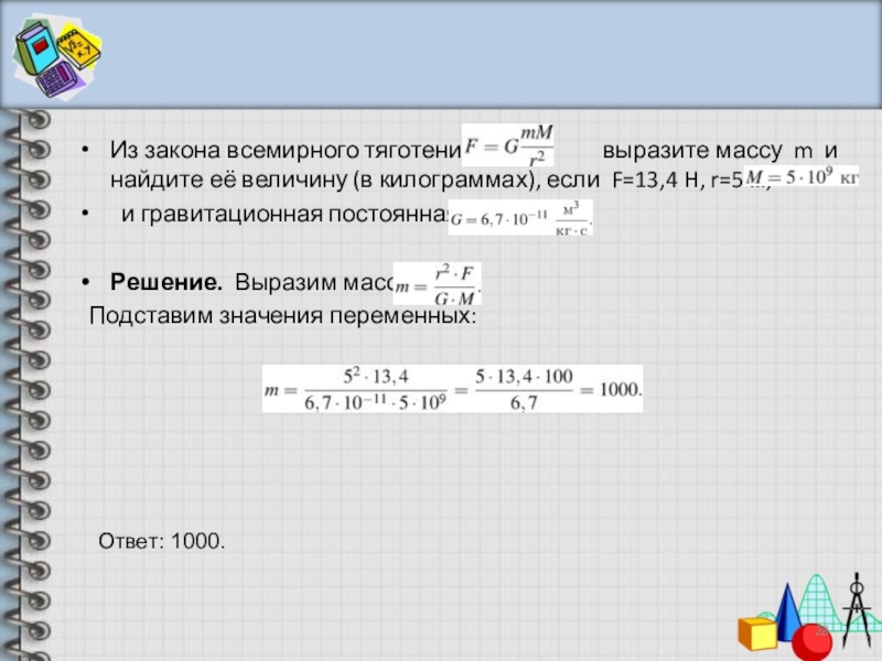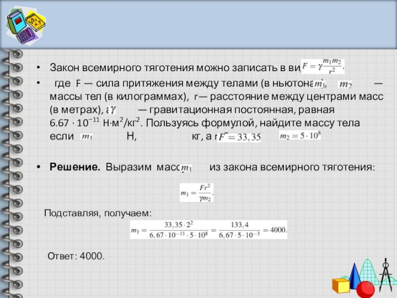 сила притяжения между телами (в ньютонах), и — массы тел (в килограммах), r— расстояние между центрами масс (в метрах), а — гравитационная постоянная, равная 6.67 · 10−11 H·м2/кг2. Пользуясь формулой, найдите массу тела (в килограммах), если Н, кг, а r=2 м.