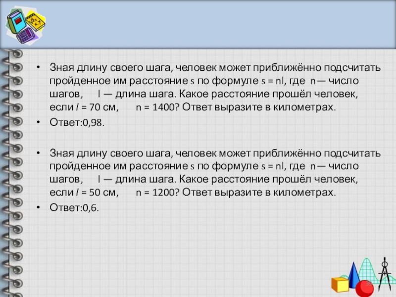 s по формуле s = nl, где n— число шагов, l — длина шага. Какое расстояние прошёл человек, если l = 70 см, n = 1400? Ответ выразите в километрах.