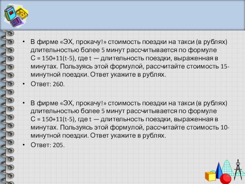 Слайд 2В фирме «ЭХ, прокачу!» стоимость поездки на такси (в рублях) длительностью