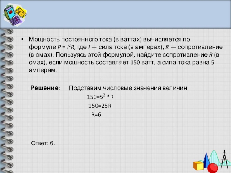 амперах), R — сопротивление (в омах). Пользуясь этой формулой, найдите сопротивление R (в омах), если мощность составляет 150 ватт, а сила тока равна 5 амперам.