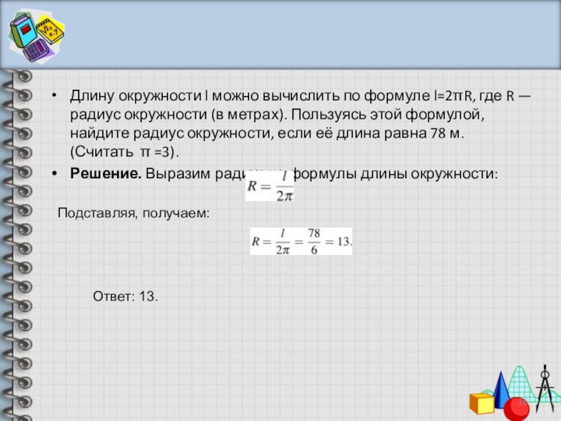 формулой, найдите радиус окружности, если её длина равна 78 м. (Считать π =3).