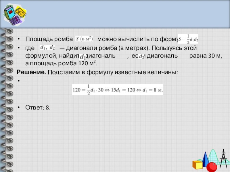 где — диагонали ромба (в метрах). Пользуясь этой формулой, найдите диагональ , если диагональ равна 30 м, а площадь ромба 120 м2.