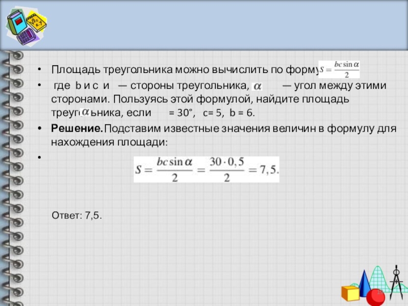 и с и — стороны треугольника, а — угол между этими сторонами. Пользуясь этой формулой, найдите площадь треугольника, если = 30°, c= 5, b = 6.