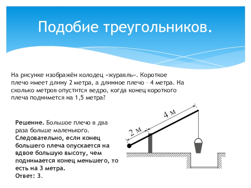 Решение. Большое плечо в два раза больше маленького. Следовательно, если конец большего плеча опускается на вдвое большую высоту, чем поднимается конец меньшего, то есть на 3 метра.