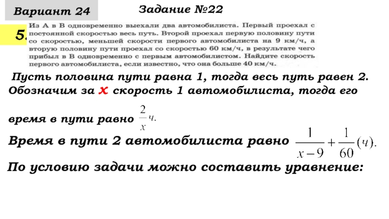 Обозначим за х скорость 1 автомобилиста, тогда его время в пути равно:…