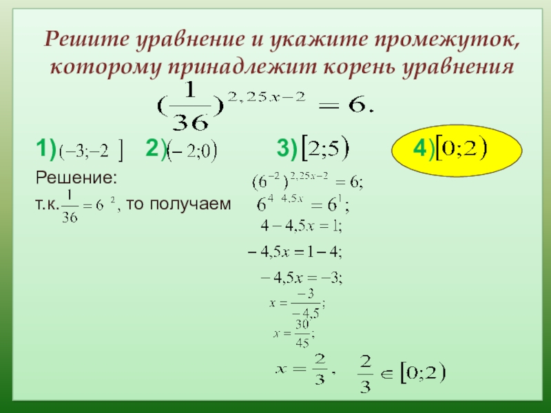 Решите уравнение и укажите промежуток, которому принадлежит корень уравнения1)       2)