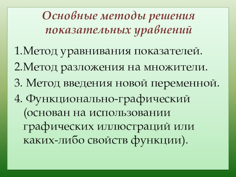 Основные методы решения показательных уравнений1.Метод уравнивания показателей.2.Метод разложения на множители.3. Метод введения новой переменной.4. Функционально-графический (основан на