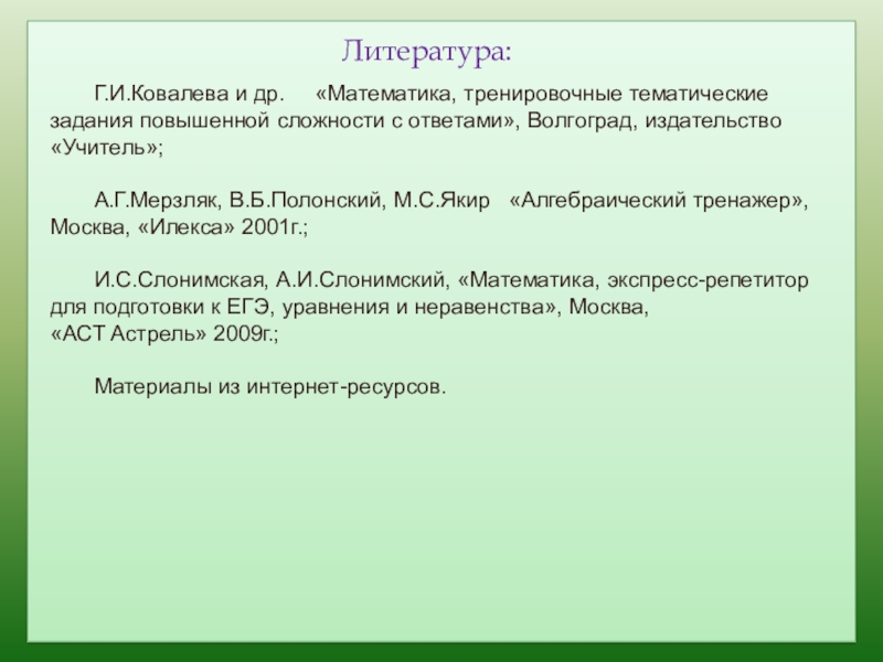 Литература:	Г.И.Ковалева и др.   «Математика, тренировочные тематические задания повышенной сложности с ответами», Волгоград, издательство «Учитель»;	А.Г.Мерзляк, В.Б.Полонский,
