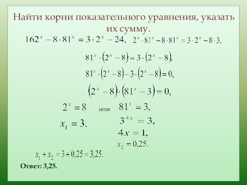 Найти корни показательного уравнения, указать их сумму.илиОтвет: 3,25.