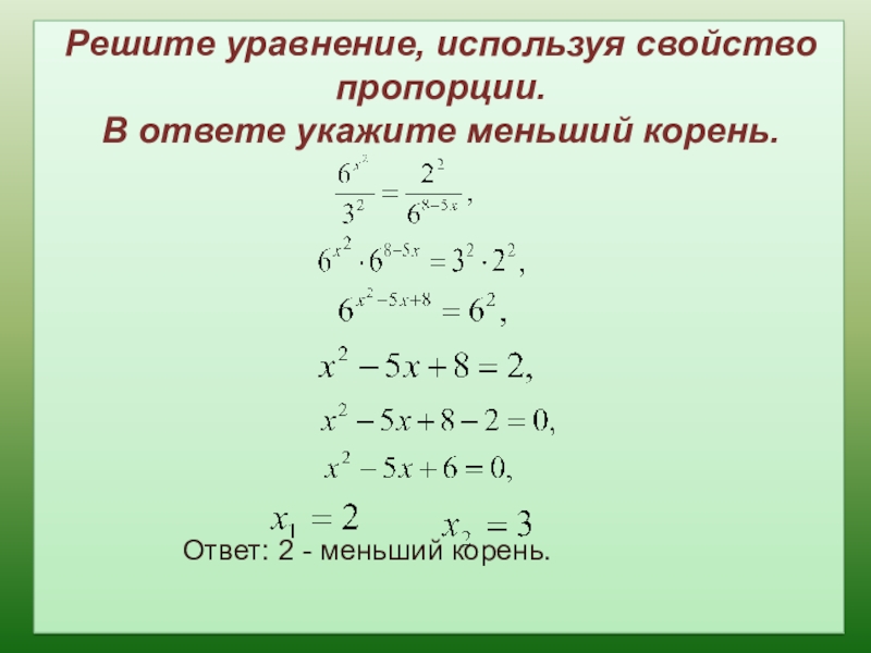 Решите уравнение, используя свойство пропорции. В ответе укажите меньший корень.