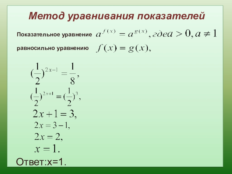 Метод уравнивания показателей  Показательное уравнение равносильно уравнению									 					Ответ:х=1.