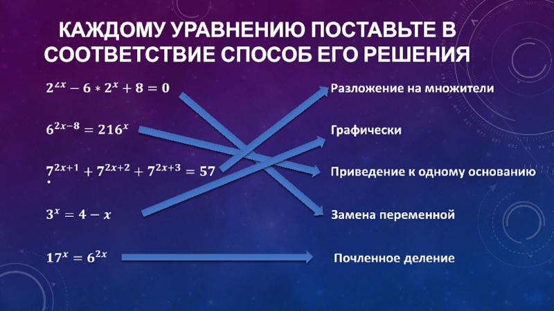 Слайд 5Каждому уравнению поставьте в соответствие способ его решения