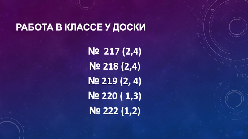 Работа в классе у доски№ 217 (2,4)№ 218 (2,4)№ 219 (2, 4)№ 220 ( 1,3)№ 222 (1,2)