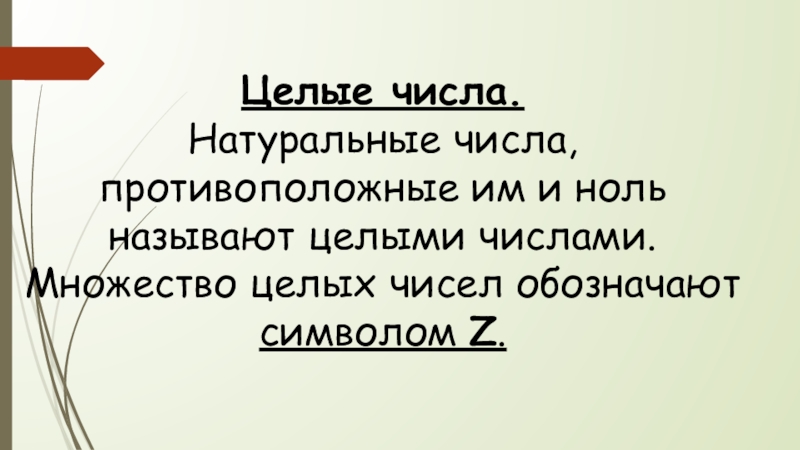 Целые числа.  Натуральные числа, противоположные им и ноль называют целыми числами. Множество целых чисел обозначают