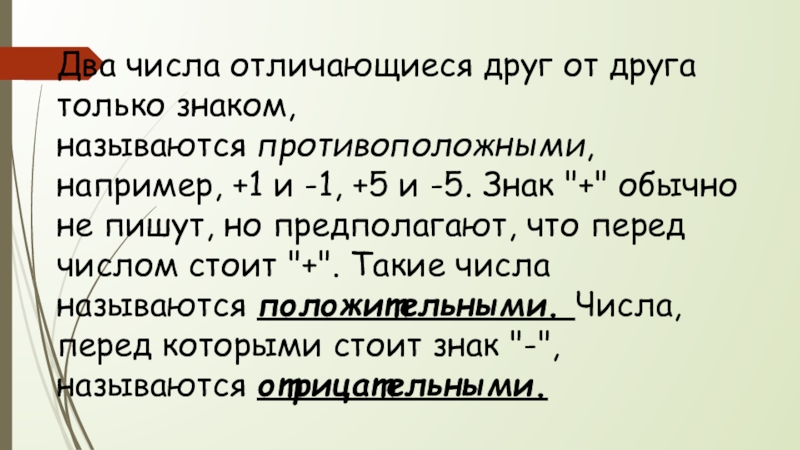 Слайд 5Два числа отличающиеся друг от друга только знаком, называются противоположными, например, +1