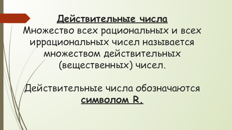 Действительные числа Множество всех рациональных и всех иррациональных чисел называется множеством действительных (вещественных) чисел.  Действительные числа
