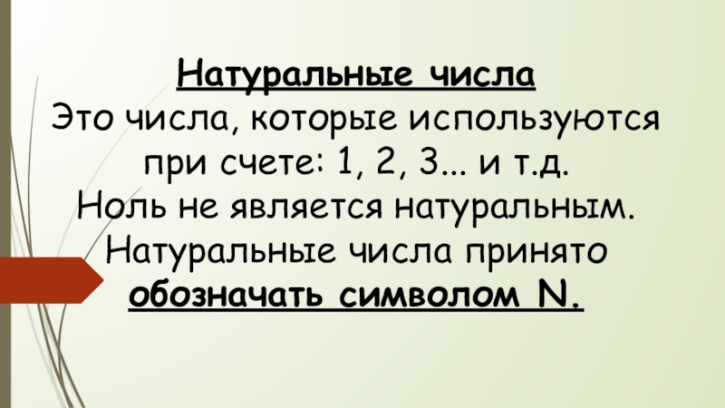 Натуральные числа Это числа, которые используются при счете: 1, 2, 3... и т.д. Ноль не является натуральным.