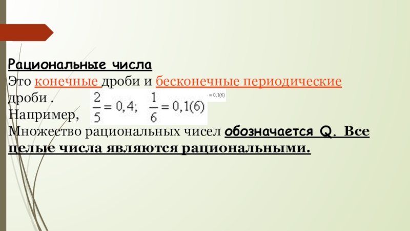 Слайд 6 Рациональные числа Это конечные дроби и бесконечные периодические дроби . Например, Множество рациональных чисел обозначается Q. Все