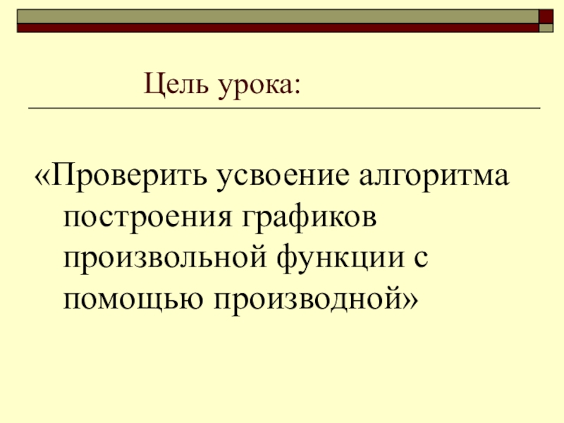 Цель урока:«Проверить усвоение алгоритма построения графиков произвольной функции с помощью производной»