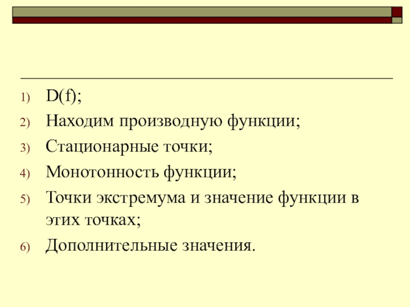 D(f);Находим производную функции;Стационарные точки;Монотонность функции;Точки экстремума и значение функции в этих точках;Дополнительные значения.