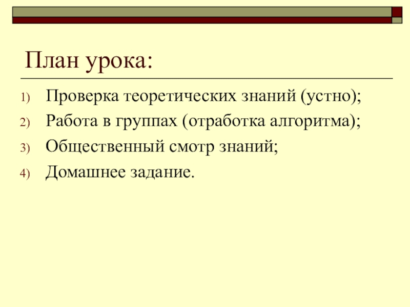 План урока:Проверка теоретических знаний (устно);Работа в группах (отработка алгоритма);Общественный смотр знаний;Домашнее задание.