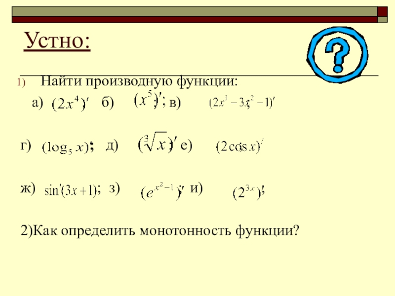 Устно:Найти производную функции:  а)     ;  б)     ;