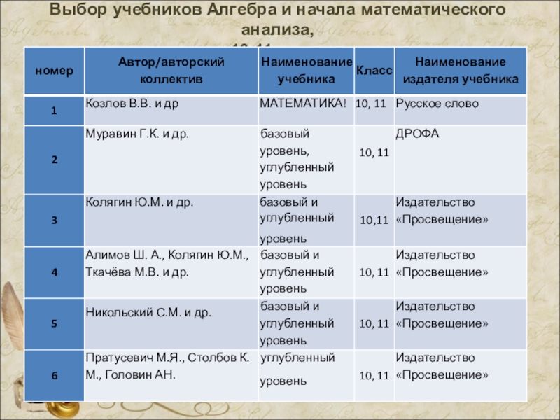 Слайд 6Выбор учебников Алгебра и начала математического анализа,