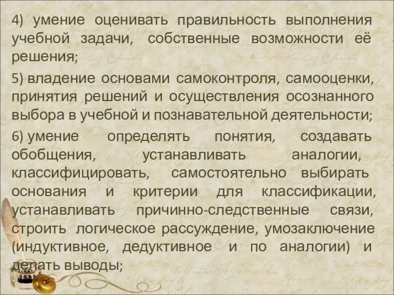6) умение определять понятия, создавать обобщения, устанавливать аналогии, классифицировать, самостоятельно выбирать основания и критерии для классификации, устанавливать причинно-следственные связи, строить логическое рассуждение, умозаключение (индуктивное, дедуктивное и по аналогии) и делать выводы;
