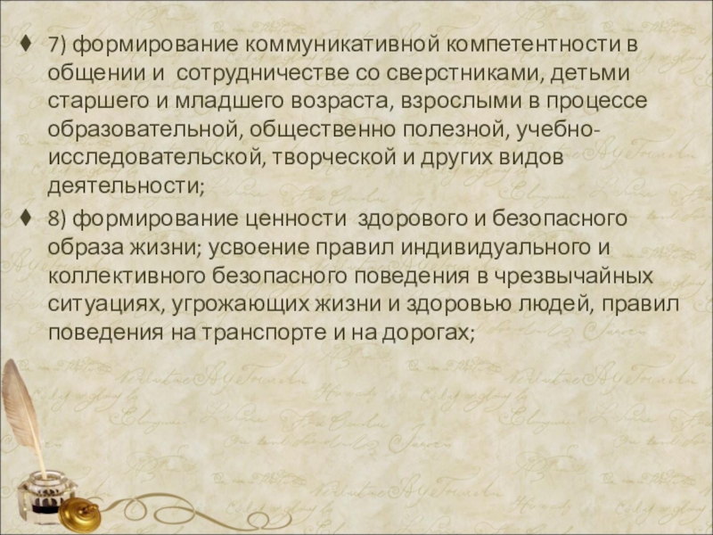 8) формирование ценности здорового и безопасного образа жизни; усвоение правил индивидуального и коллективного безопасного поведения в чрезвычайных ситуациях, угрожающих жизни и здоровью людей, правил поведения на транспорте и на дорогах;