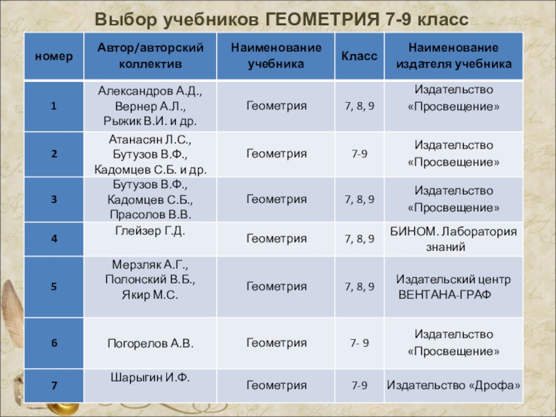 Слайд 4Выбор учебников ГЕОМЕТРИЯ 7-9 класс
