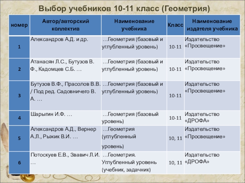 Слайд 5Выбор учебников 10-11 класс (Геометрия)