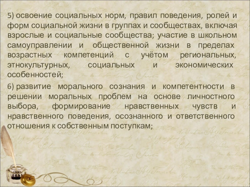 6) развитие морального сознания и компетентности в решении моральных проблем на основе личностного выбора, формирование нравственных чувств и нравственного поведения, осознанного и ответственного отношения к собственным поступкам;