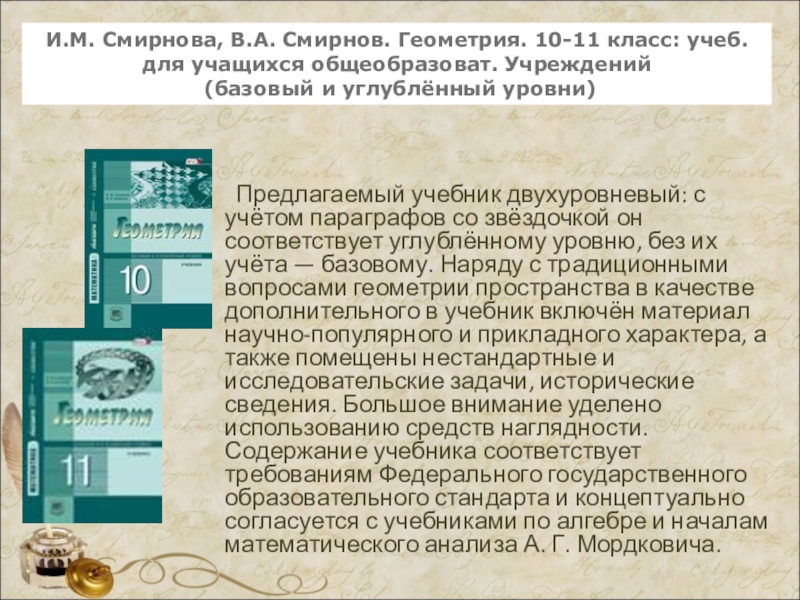 углублённому уровню, без их учёта — базовому. Наряду с традиционными вопросами геометрии пространства в качестве дополнительного в учебник включён материал научно-популярного и прикладного характера, а также помещены нестандартные и исследовательские задачи, исторические сведения. Большое внимание уделено использованию средств наглядности. Содержание учебника соответствует требованиям Федерального государственного образовательного стандарта и концептуально согласуется с учебниками по алгебре и началам математического анализа А. Г. Мордковича.