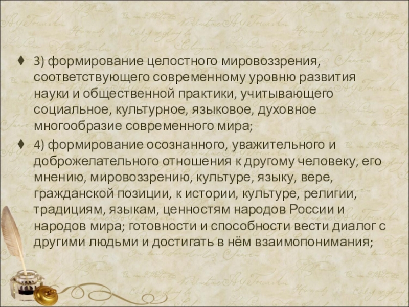 3) формирование целостного мировоззрения, соответствующего современному уровню развития науки и общественной практики,