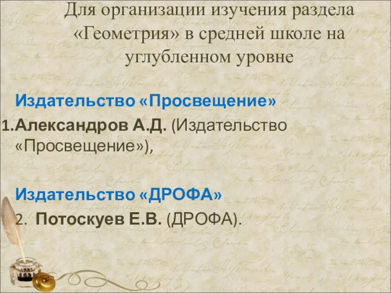 Слайд 22Для организации изучения раздела «Геометрия» в средней школе на углубленном уровне