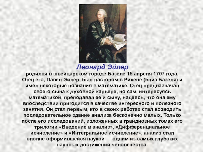 Леонард Эйлерродился в швейцарском городе Базеле 15 апреля 1707 года. Отец его, Павел Эйлер, был пастором в