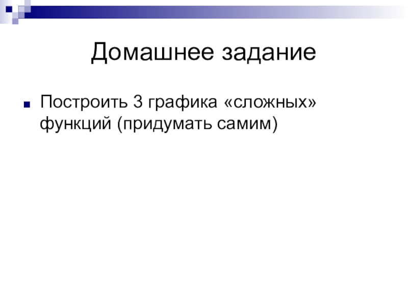 Домашнее заданиеПостроить 3 графика «сложных» функций (придумать самим)