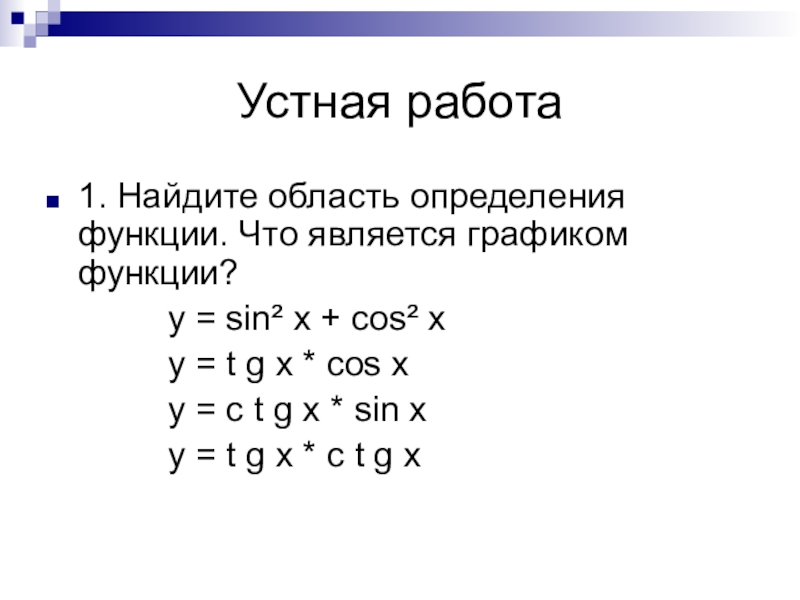 Устная работа1. Найдите область определения функции. Что является графиком функции? y = sin² x + cos² x y = t g x * cos x y = c t g x * sin x y = t g x *
