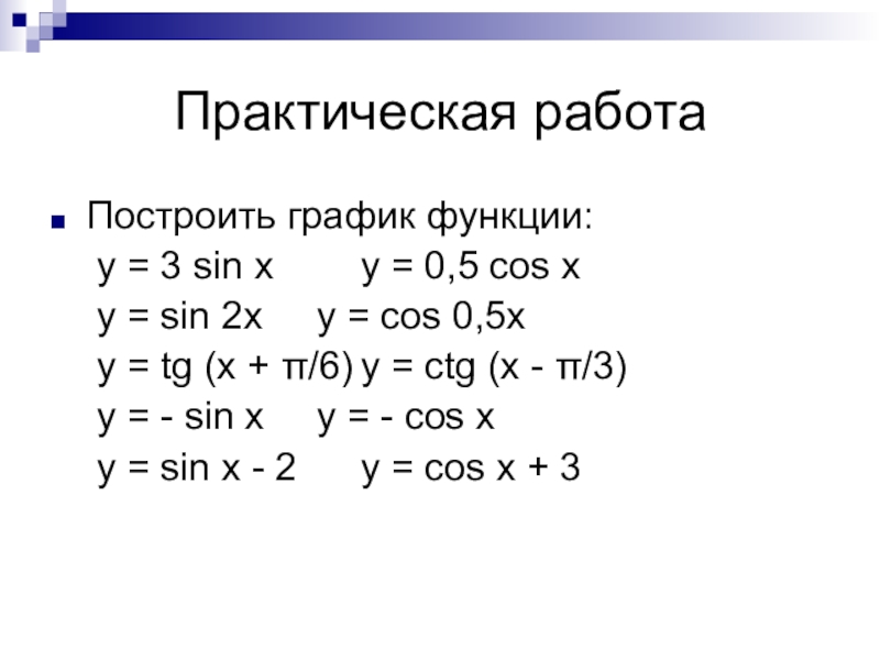 Практическая работа Построить график функции:	y = 3 sin x		y = 0,5 cos x	y = sin 2x		y =