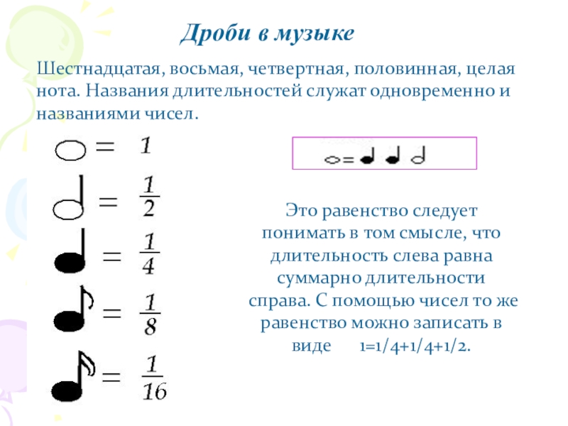 Это равенство следует понимать в том смысле, что длительность слева равна суммарно длительности справа. С помощью чисел то же равенство можно записать в виде 1=1/4+1/4+1/2.