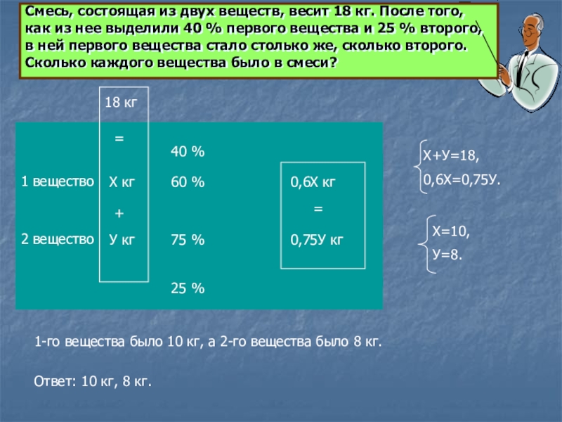 1-го вещества было 10 кг, а 2-го вещества было 8 кг.