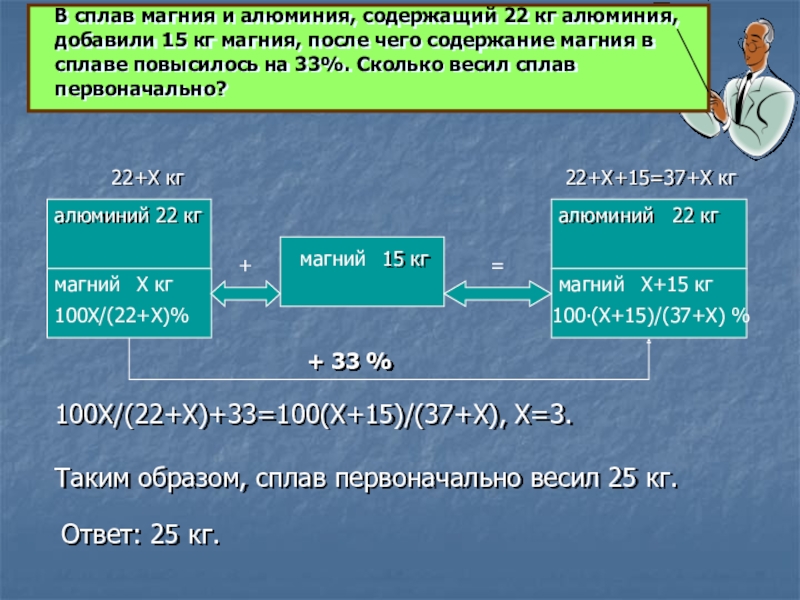 В сплав магния и алюминия, содержащий 22 кг алюминия, добавили 15 кг магния, после чего содержание магния в сплаве повысилось на 33%. Сколько весил сплав первоначально?