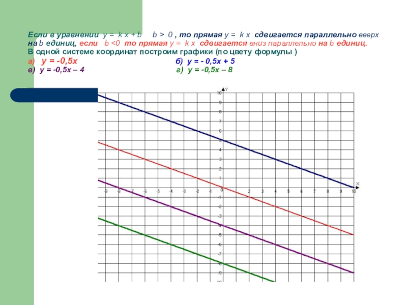 b > 0 , то прямая y = k x сдвигается параллельно вверх на b единиц, если b <0 то прямая y = k x сдвигается вниз параллельно на b единиц.