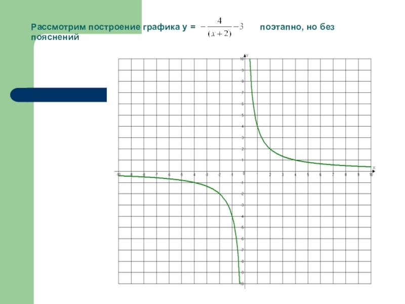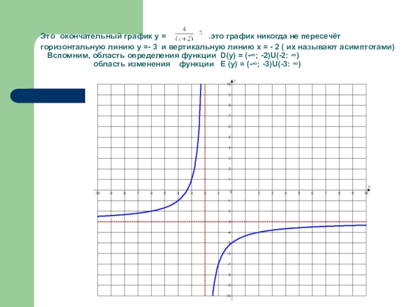 никогда не пересечёт горизонтальную линию у =- 3 и вертикальную линию х = - 2 ( их называют асимптотами)