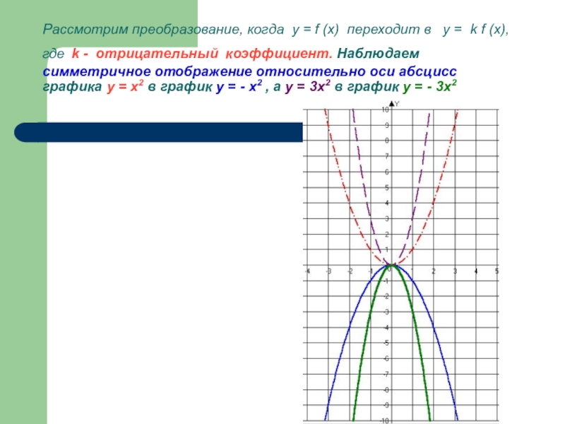 = k f (x), где k - отрицательный коэффициент. Наблюдаем симметричное отображение относительно оси абсцисс графика у = х2 в график у = - х2 , а у = 3х2 в график у = - 3х2