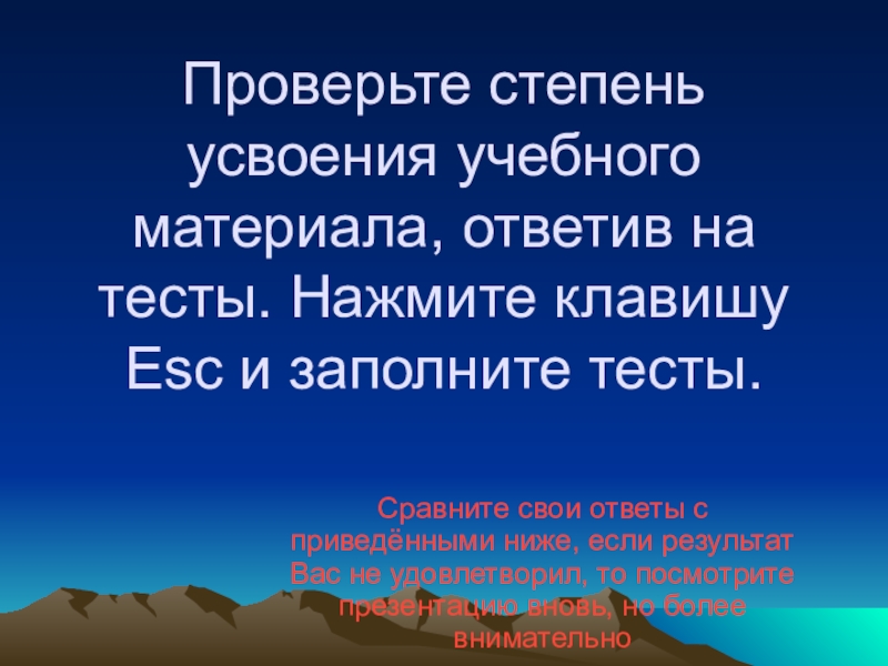 Слайд 37Проверьте степень усвоения учебного материала, ответив на тесты. Нажмите клавишу Esc
