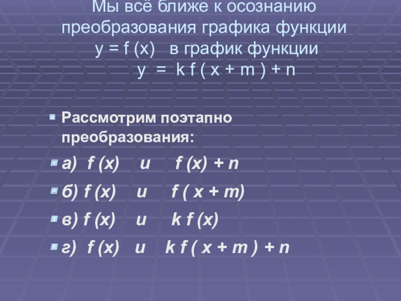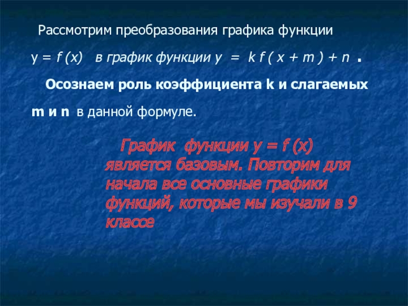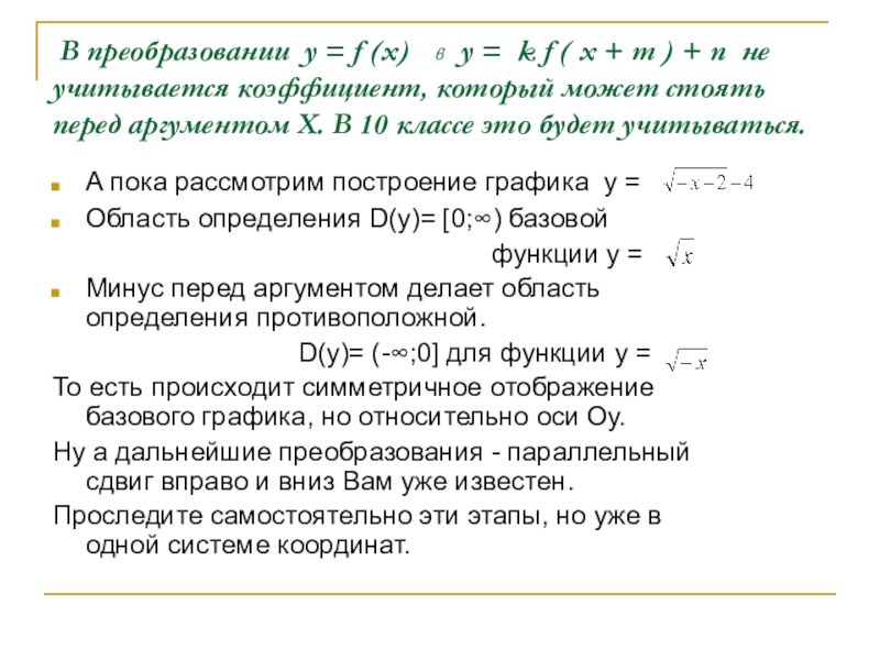 k f ( x + m ) + n не учитывается коэффициент, который может стоять перед аргументом Х. В 10 классе это будет учитываться.