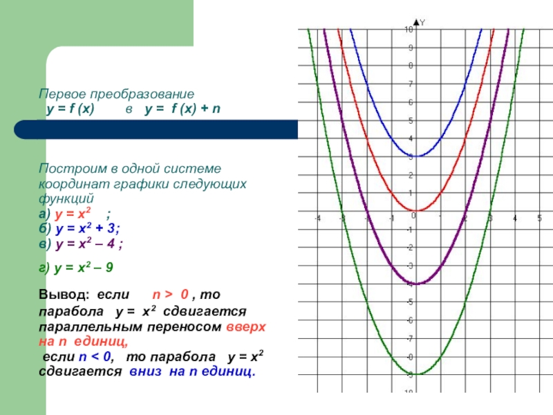 Вывод: если n > 0 , то парабола y = x2 сдвигается параллельным переносом вверх на n единиц,